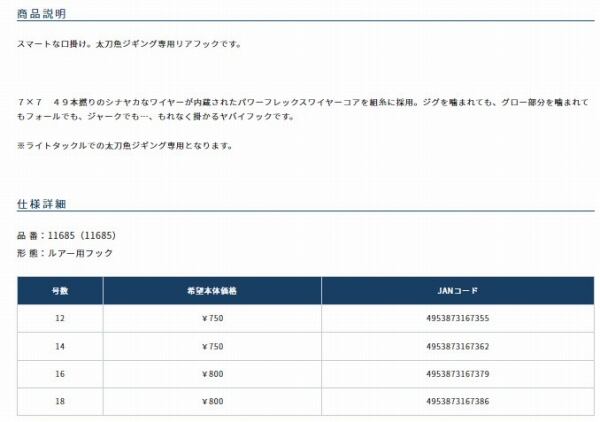 7×7 49本撚りのシナヤカなワイヤーが内蔵されたパワーフレックスワイヤーコアを組糸に採用。ジグを噛まれても、グロー部分を噛まれてもフォールでも、ジャークでも…、もれなく掛かるヤバイフックです。