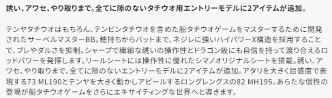 テンヤタチウオはもちろん、テンビンタチウオを含めた船タチウオゲームをマスターするために開発されたサーベルマスターBB。穂持ちからバットまで、ネジレに強いハイパワーX構造を採用することで、ブレやダルさを抑制。シャープで繊細な誘いの操作性とドラゴン級にも自信を持って渡り合えるロッドパワーを発揮します。リールシートには操作性に優れたシマノオリジナルシートを搭載。誘い、アワセ、やり取りまで、全てに隙のないエントリーモデルに2アイテムが追加。アタリを大きく目感度で表現する73 ML190とテンヤを大きく動かしアピールするロングレングスの82 MH195。新たな個性の登場が船タチウオゲームをさらにエキサイティングな世界へと導きます。