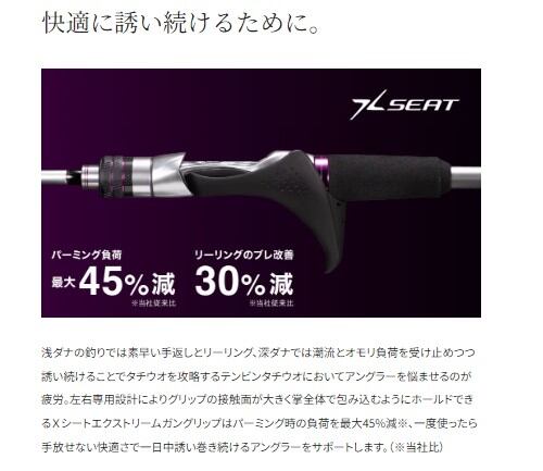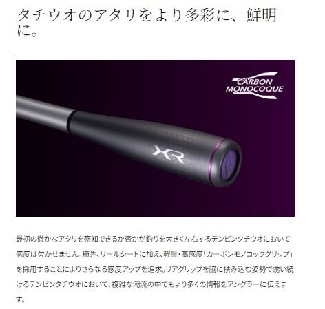 タチウオがエサをついばむ微かな変化を逃さない感度、喰いアタリへと導くしなやかさ、しっかりと掛け大型タチウオにも対応するパワー。それらテンビンタチウオに求められる性能をシマノテクノロジーにより高次元で追求したハイスペックロッドがサーベルマスター XR テンビン。誘いと喰い込みを両立させた7:3調子。海面直下から100mを超えるタナまで幅広いレンジと使用オモリに対応する3タイプ。