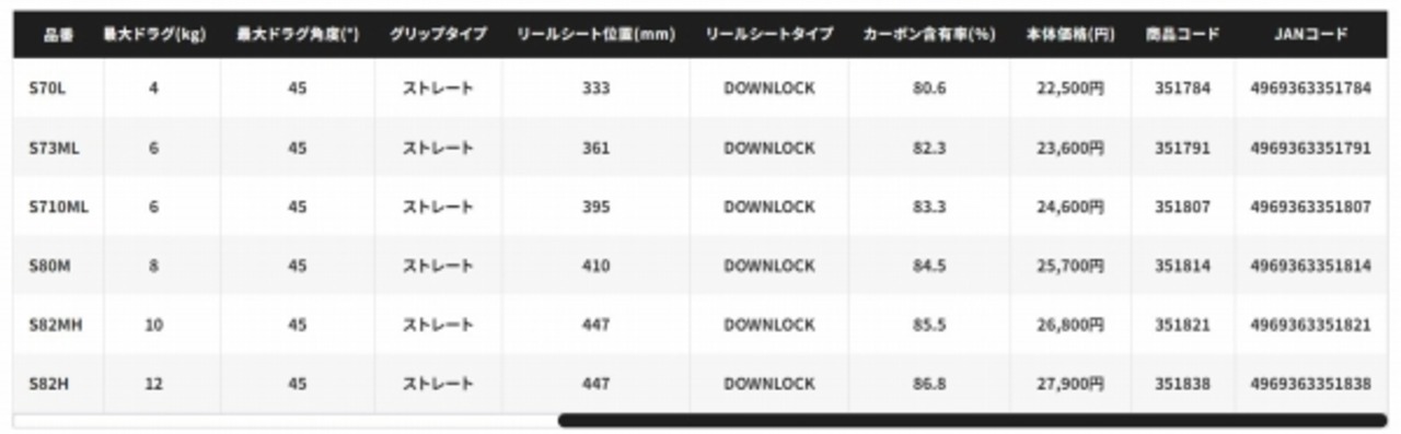 ラインナップはすべてスピニングタイプで、近海テクニカルモデルのS70L、S73ML、S710ML、S80Mや、大型青物&マグロ類対応のパワーモデルであるS82MH、S82Hを揃えた全6アイテム。軽量ルアーを多用する近海のゲームから、遠征やビッグゲームまで、ターゲットに合わせてチョイスすることが可能だ。