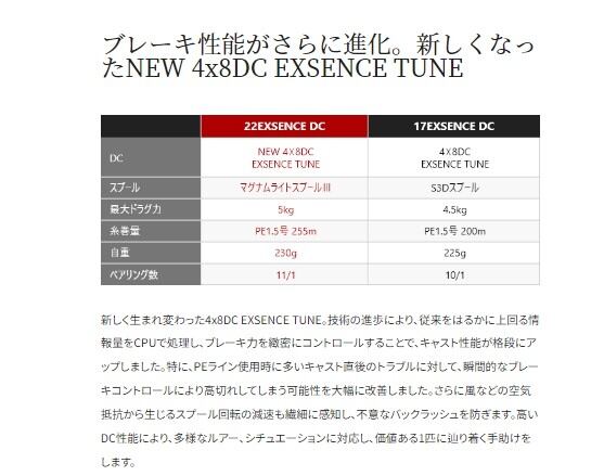 技術の進歩により生まれ変わったNEW 4x8 DC EXSENCE TUNE。これまで以上により緻密なブレーキの制御が可能になりました。また、MGLスプール?、サイレントチューン、S3Dスプールとの相乗効果によりキャスト性能が劇的に進化しています。特にPEライン使用時に多いキャスト直後のトラブルに対して、瞬間的なブレーキコントロールにより高切れしてしまう可能性を大幅に低減しています。また、最大ドラグ力や糸巻量が増え、よりバーサタイルになりました。時には青物とも対峙できる潜在能力を秘めたベイトリールが誕生しました。