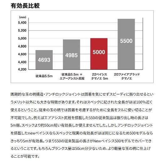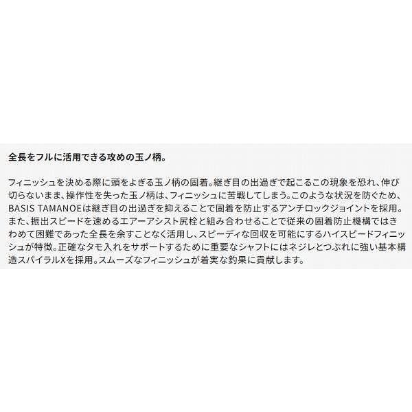 フィニッシュを決める際に頭をよぎる玉ノ柄の固着。継ぎ目の出過ぎで起こるこの現象を恐れ、伸び切らないまま、操作性を失った玉ノ柄は、フィニッシュに苦戦してしまう。このような状況を防ぐため、BASIS TAMANOEは継ぎ目の出過ぎを抑えることで固着を防止するアンチロックジョイントを採用。また、振出スピードを速めるエアーアシスト尻栓と組み合わせることで従来の固着防止機構ではきわめて困難であった全長を余すことなく活用し、スピーディな回収を可能にするハイスピードフィニッシュが特長。正確なタモ入れをサポートするために重要なシャフトにはネジレとつぶれに強い基本構造スパイラルXを採用。スムーズなフィニッシュが着実な釣果に貢献します。