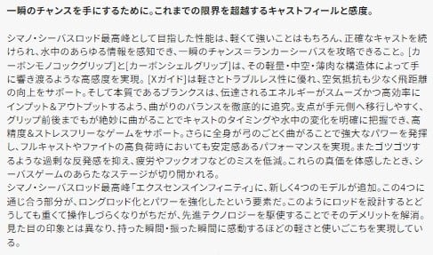 シマノ・シーバスロッド最高峰「エクスセンスインフィニティ」に、新しく4つのモデルが追加。この4つに通じ合う部分が、ロングロッド化とパワーを強化したという要素だ。このようにロッドを設計するとどうしても重くて操作しづらくなりがちだが、先進テクノロジーを駆使することでそのデメリットを解消。見た目の印象とは異なり、持った瞬間・振った瞬間に感動するほどの軽さと使い心地を実現している。