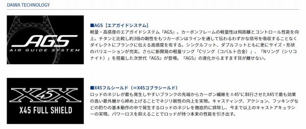 ティップからバットへスムーズにパワー伝達する調子をさらに追及しながらも、バットのパワーと張りをアップさせて、ブランクスを現代のルアーに合わせて最適化。ボートシーバスロッドの最高峰としてキャスト性能と操作性に磨きをかけた。ネジレ抑制効果の高いX45フルシールドによって、パワーロスを大幅に解消。遠投性、ルアー操作性、魚を寄せるパワーをさらに向上。流行のミノーのジャーキングや、大型トップウォータープラグに対応するラインナップも追加。