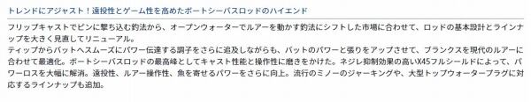 フリップキャストでピンに撃ち込む釣法から、オープンウォーターでルアーを動かす釣法にシフトした市場に合わせて、ロッドの基本設計とラインナップを大きく見直してリニューアル。