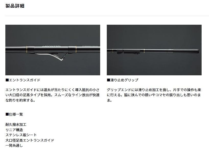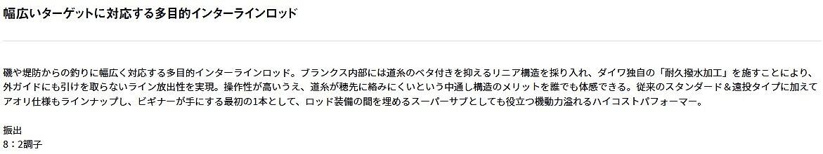 磯や堤防からの釣りに幅広く対応する多目的インターラインロッド。ブランクス内部には道糸のベタ付きを抑えるリニア構造を採り入れ、ダイワ独自の「耐久撥水加工」を施すことにより、外ガイドにも引けを取らないライン放出性を実現。操作性が高いうえ、道糸が穂先に絡みにくいという中通し構造のメリットを誰でも体感できる。従来のスタンダード&遠投タイプに加えてアオリ仕様もラインナップし、ビギナーが手にする最初の1本として、ロッド装備の間を埋めるスーパーサブとしても役立つ機動力溢れるハイコストパフォーマー。