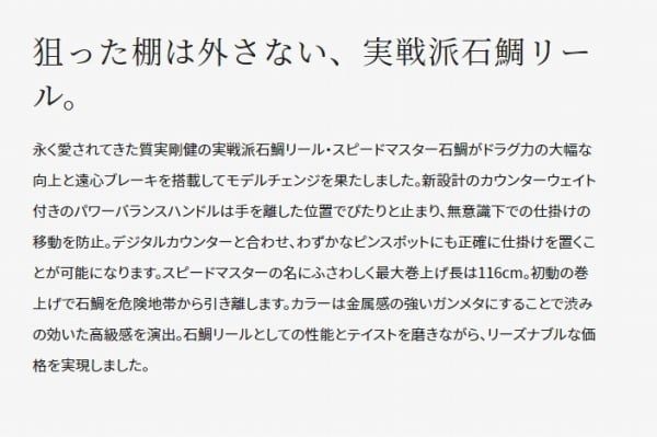 永く愛されてきた質実剛健の実戦派石鯛リール・スピードマスター石鯛がドラグ力の大幅な向上と遠心ブレーキを搭載してモデルチェンジを果たしました。新設計のカウンターウェイト付きのパワーバランスハンドルは手を離した位置でぴたりと止まり、無意識下での仕掛けの移動を防止。デジタルカウンターと合わせ、わずかなピンスポットにも正確に仕掛けを置くことが可能になります。スピードマスターの名にふさわしく最大巻上げ長は116cm。初動の巻上げで石鯛を危険地帯から引き離します。カラーは金属感の強いガンメタにすることで渋みの効いた高級感を演出。石鯛リールとしての性能とテイストを磨きながら、リーズナブルな価格を実現しました。