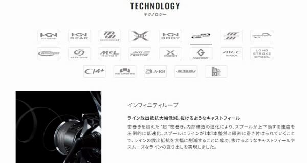 MGLシリーズの頂点としての軽量化、低慣性化、感度アップの追求はもちろん、インフィニティテクノロジーにより、抜けるようなキャストフィール、耐久性、巻きごこちとパワーを手に入れた。さらにライントラブルレス性能、ドラグの耐摩耗性能も大幅に向上。