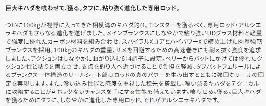 ついに100kgが視野に入ってきた相模湾のキハダ釣り。モンスターを獲るべく、専用ロッド・アルシエラキハダもさらなる進化を遂げました。メインブランクスにしなやかで粘り強いUDグラス材料と軽量で強度に優れたカーボン材料を組み合わせ、スパイラルXコアとハイパワーXで締め上げた肉厚強靭ブランクスを採用。100kgのキハダの重量、サメを回避するための高速巻きにも耐え抜く強度を追求しました。アクションはしなやかに曲がり込む6:4調子に設定。ベリーからバットにかけては優れたクッション性と粘りを両立させ、支点を釣り人へ近づけることで負担を軽減、タフバットフェルールによるブランクス一体構造のリールシート部はロッドの真のパワーを生み出すとともに強固なリールの固定を実現します。また、喰い込み性能と感度を重視した穂先を搭載し、喰い渋るキハダをテクニカルに攻略することが可能。少ないチャンスを手にする性能も備えています。喰わせる。獲る。巨大キハダを獲るためにタフに、しなやかに進化した専用ロッド。それがアルシエラキハダです。