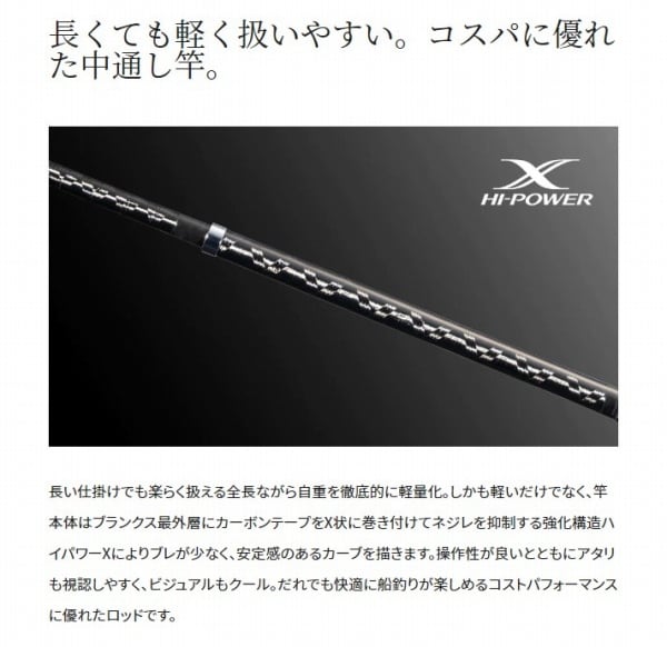 軽量ブランクスとハイパワーXが快適な操作性をサポート。ハイコストパフォーマンス中通し船竿。