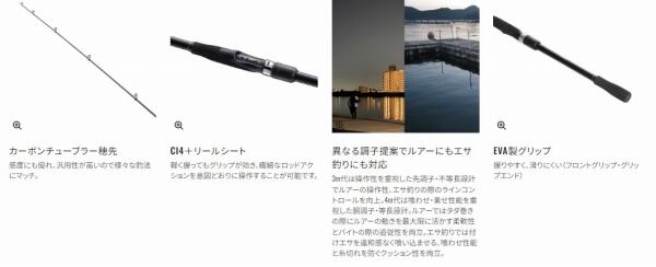 機動性の良い振出ロッドに、軽快さとオールラウンドな性能の両立を追求。様々な実釣シーンを想定し、レングスごとに調子・設計を再構築しました。3m台はルアーのジャーク&アクション等、操作性を意識した、先軽・不等長設計。4m台はただ巻きでのルアーの動きに安定性を与えるしなやかさ、ショートバイトの喰わせ性能、ファイトの際の追従性を向上させた等長設計。より汎用性を向上させるためにパワーランクも見直したブランクスには、ロッドのネジレ、つぶれに対する強度を高めるスパイラルXを採用し、キャスト〜ファイトに至るまでの一連の動作を頼もしくサポート。アングラーの想像を掻き立てる1本で、魚との出会いを近づけます。