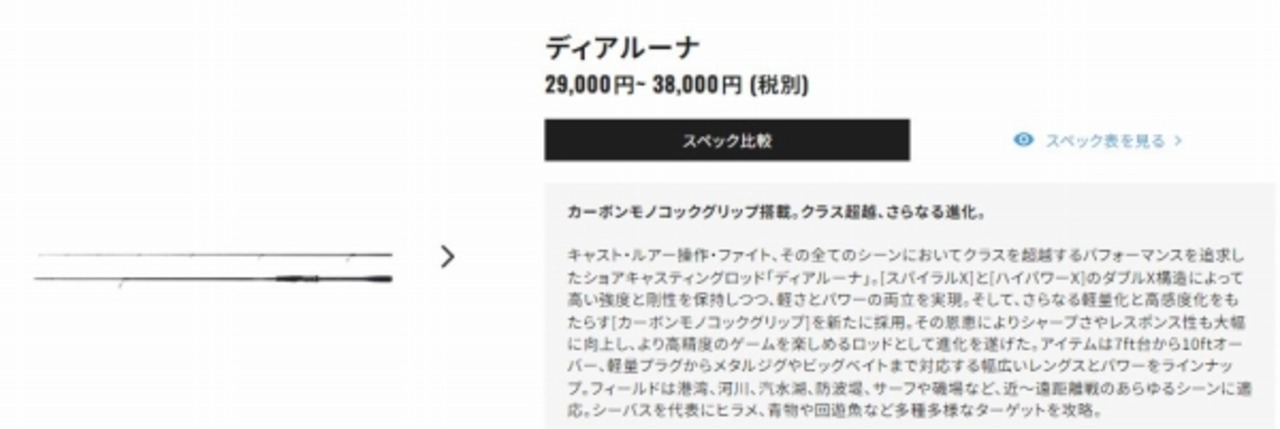 キャスト・ルアー操作・ファイト、その全てのシーンにおいてクラスを超越するパフォーマンスを追求したショアキャスティングロッド「ディアルーナ」。[スパイラルX]と[ハイパワーX]のダブルX構造によって高い強度と剛性を保持しつつ、軽さとパワーの両立を実現。そして、さらなる軽量化と高感度化をもたらす[カーボンモノコックグリップ]を新たに採用。その恩恵によりシャープさやレスポンス性も大幅に向上し、より高精度のゲームを楽しめるロッドとして進化を遂げた。アイテムは7ft台から10ftオーバー、軽量プラグからメタルジグやビッグベイトまで対応する幅広いレングスとパワーをラインナップ。フィールドは港湾、河川、汽水湖、防波堤、サーフや磯場など、近〜遠距離戦のあらゆるシーンに適応。シーバスを代表にヒラメ、青物や回遊魚など多種多様なターゲットを攻略。