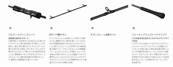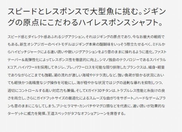 スピード感とダイレクト感あふれるジグアクション。それはジギングの原点であり、今なお最大の戦術でもある。新生オシアジガーのベイトモデルはジギング本来の醍醐味をいっそう際立たせるべく、ミドルからハイピッチジャークによる速い誘いや鋭いジグアクションをより意のままに操れるように進化。ファストテーパー&高弾性化によってレスポンス性を徹底的に向上。シマノ独自のテクノロジーであるスパイラルXコア、ハイパワーXを採用してネジレ、ブレ、パワーロスを可能な限り排除したブランクスは、細身・軽量でありながらどこまでも強靭。潮の流れが激しい海域やドテラ流しなど、強い負荷が掛かる状況においても軽快かつ高精度なジグ操作を可能にし、海が穏やかな状況ではジグの過剰な暴れを抑制しつつ、適切にコントロールする高い対応力も兼備。そしてXガイド3Dチタンは、トラブルレス性能と糸抜けの良さを両立し、さらにガイドフットサイズの最適化によるスムーズな曲がりをサポート。ハードなゲームプランも意のままにこなしてしまう。ブリ・ヒラマサ・カンパチやマグロ類などを代表に、速い誘いが効果的なターゲットに威力を発揮。王道スペックがタフなオフショアシーンを席巻する。