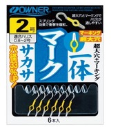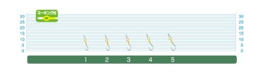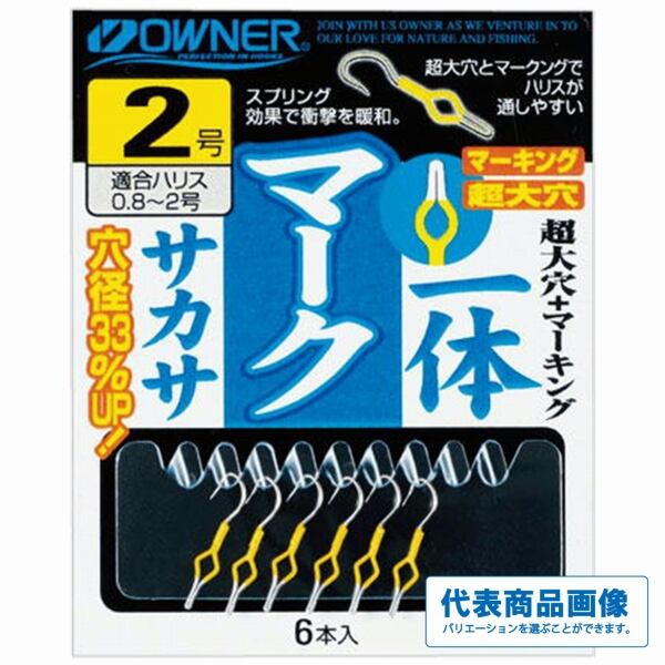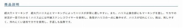 超大穴+マーキング 超大穴ハリス止とマーキングによってハリスが非常に通しやすい。また、ハリス止接合部にもマーキングを施し、サカサの状況が一目でわかる!ハリス止には平線ステンレスワイヤーを使用し、負荷がハリスの一点に集中せず、ハリスが切れにくい。鈎は、刺しやすく、外れにくい速攻サカサを使用し、手返しも抜群です。