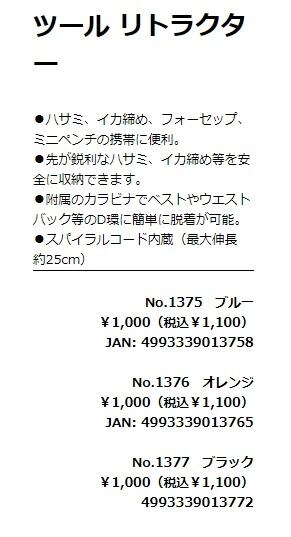 TOOL RETRACTOR(ツールリトラクター)!!ハサミ、イカ締め、フォーセップミニペンチの携帯に便利。先が鋭利なハサミ、イカ締め等を安全に収納できます。付属のカラビナでベストやウエストバック等のD環に簡単に脱着が可能。スパイラルコード内臓(最大伸長 約25cm)