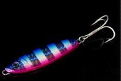 ●ZZ-STAPゼブラグローシリーズを発売します。カラーはターゲットやフィールド、使用状況を考えた厳選の4色(ピンク・パープル・ブルピン・シルバーフラッシュ)で両面ゼブラグローになっています。(ケイムラコーティングではありません。)ゼブラグローはZZ-STAPが移動するスピードの違いによる残像の変化でターゲットにアピールします。このゼブラ部分(グロー部分)は長期に渡り実釣テストを繰り返し、釣果をもとにゼブラの本数や幅を決めました。