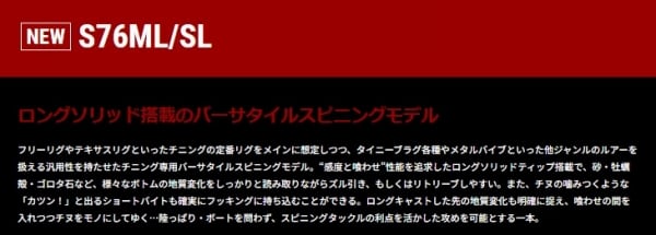 ベイト・スピニングモデル共にカーボンソリッドティップを採用し、そのソリッド素材のレングスを変更することによって、チニングゲームをよりテクニカルに展開することを可能とした。通常からやや長めのソリッド長であるSLモデルは、ロッドワークでのアクションはもちろんのこと、リトリーブ(巻き)でのボトムトレースまで意識したバーサタイルな性能を持つ。高感度であることに加え、ボトムにタッチした瞬間に弾きすぎないクッション性能や、チヌ独特の噛むようなショートバイトを掛けられる性能も兼備する。