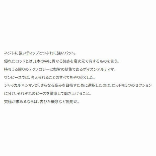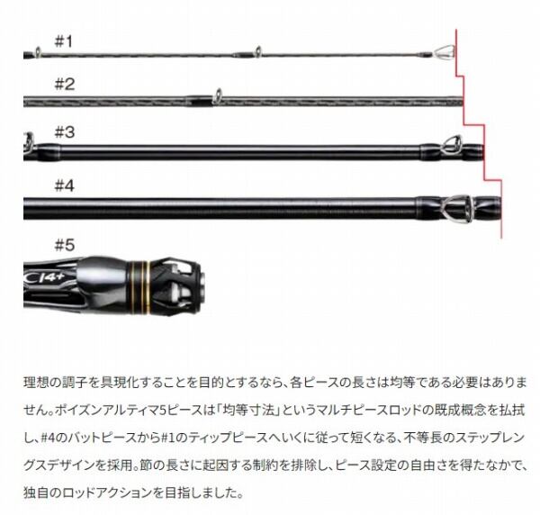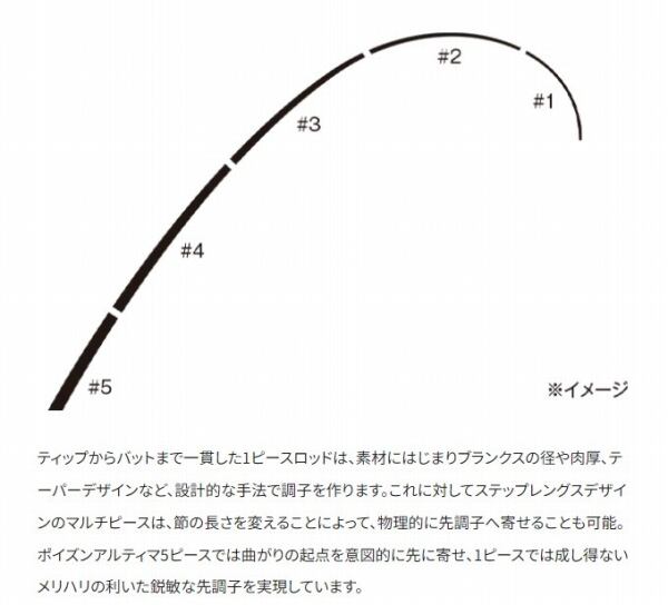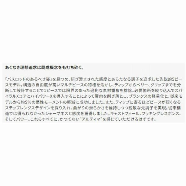 「バスロッドのあるべき姿」を見つめ、研ぎ澄まされた感度と新たなる調子を追求した先鋭的5ピースモデル。構造の自由度が高いマルチピースの特権を活かし、ティップからベリー、グリップまでを分断して設計することで1ピースでは限界のあった過剰な素材重複を排除。必要箇所を絞り込んでスパイラルXコアとハイパワーXを導入することによって贅肉を削ぎ落とし、ブランクスの軽量化と、従来モデルから約5%の慣性モーメントの軽減に成功しました。また、ティップに寄るほどピースが短くなるステップレングスデザインを採り入れ、曲がりの滑らかさを維持しつつ鋭敏な先調子を実現。従来構造では得られなかったシャープネスと感度を獲得しました。キャストフィール、フッキングレスポンス、そしてパワー。これらすべてに、かつてない“アルティマ”を感じていただけるはずです。