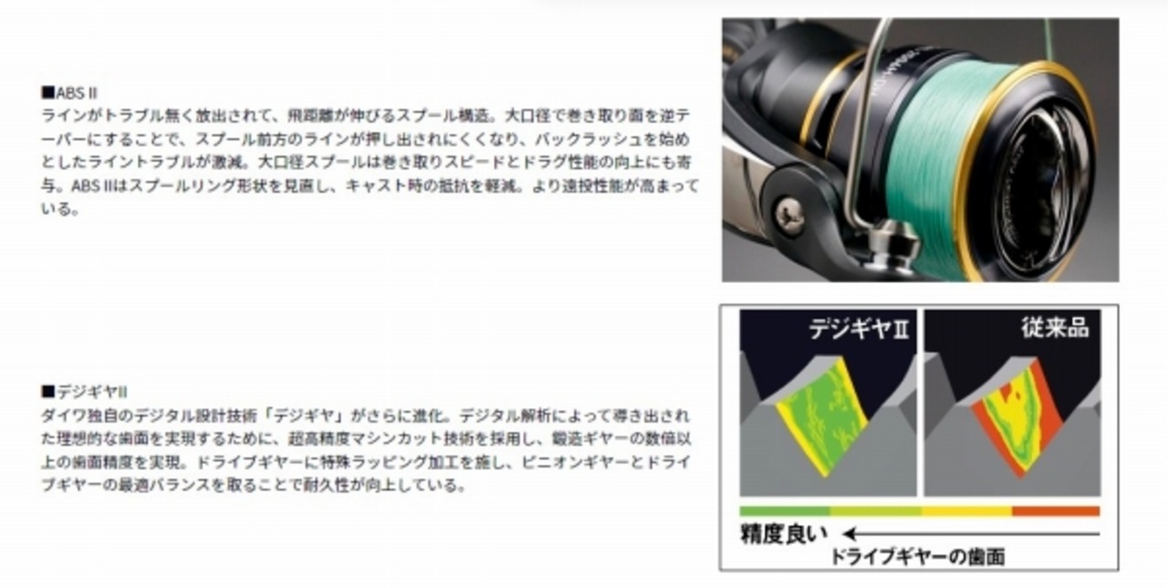 軽さと剛性の高さを両立した新型ボディにインフィニットストッパーを搭載することで、巻心地はしっかり&滑らか。PEラインがはじめからスプールに巻いてあるため、買ってすぐに釣り場で使える点もメリット。高剛性のデジギヤII、ライントラブルを激減させて快適な飛びをもたらすABS II、クロスラップ、ツイストバスターIIなどのダイワテクノロジーを豊富に搭載した充実の仕様。ブラックですっきりまとめられたデザインは様々なロッドに違和感なくマッチする。もちろん淡水・海水どちらのフィールドでも使用可能。