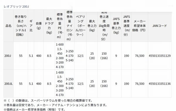 ※JAFS基準巻上力9kg:12%アップ(17LEOBRITZ 200J比較)