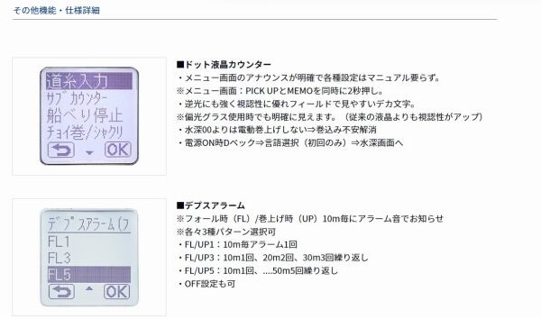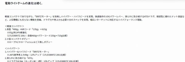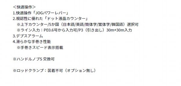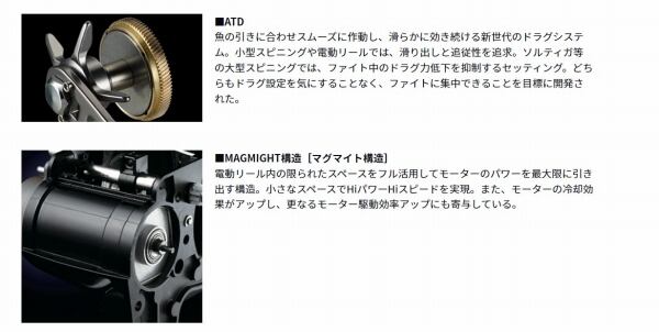 軽量コンパクトでありながら、「BRITZモーター」を採用しハイパワー・ハイスピードを実現。快適操作のJOGパワーレバー、滑らかに効き続けるATDドラグ、視認性に優れたドット液晶など、上位機種にも劣らない機能を搭載。ドラグ力や巻上力も必要十分のスペックを実現。幅広いターゲットに対応するハイパフォーマンス電動。
