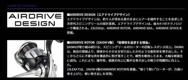 過酷なフィッシングシーンを想定し、開発されたタフリール「LEXA」。リールの心臓部であるドライブギアには、タフデジギアを搭載。外核となるボディ素材は、高強度のアルミを採用した。さらにピニオン部にマグシールドを搭載することで、LEXAの代名詞である高剛性・高耐久性を実現。新たにAIRDRIVE DESIGNを採用することで、巻き出しの軽さと重量バランスを改善し、高次元の操作性を手に入れた。ショアジギング、シーバス、SLJ、ロックフィッシュゲームなど、タフさが求められるシーンでこそ、真価を発揮する。