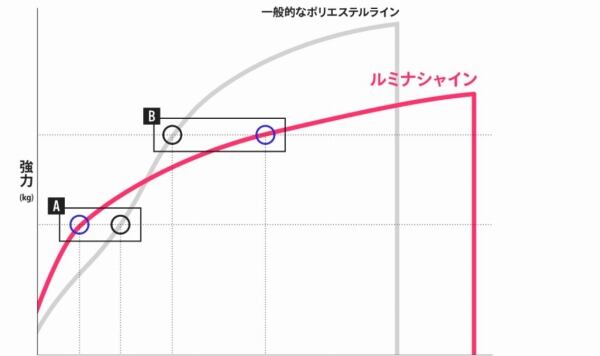 ファイト時には適度な伸度が発生し、ポリエステルラインのデメリットであった高切れやバラシ等の急な負荷へのトラブルを抑制。また、適度な伸びにより、結節強力約90%を実現!