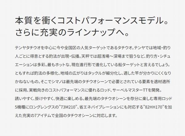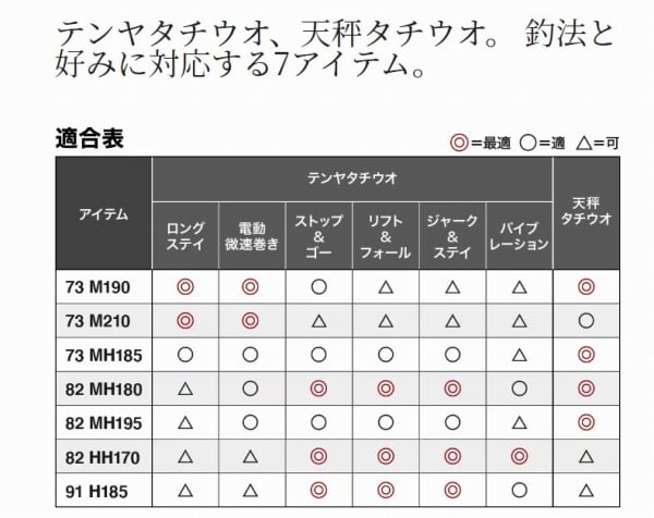 誘いやすく、掛けやすく、快適に楽しめる。最先端のタチウオシーンを存分に楽しむ専用ロッド5機種にロングレングスの”73M210”、省エネバイブレーションにも対応する”82HH170”を加えた充実の7アイテムで全国のタチウオシーンに対応します。