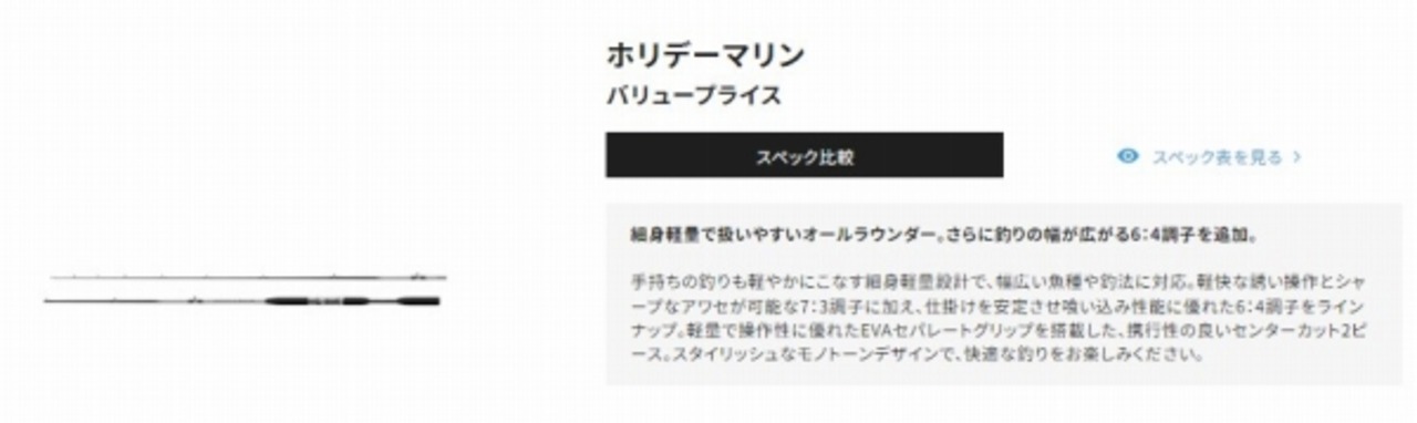 [◆沖縄/離島/北海道のお客様に対する発送が出来ません。]【メーカー希望小売価格\0】手持ちの釣りも軽やかにこなす細身軽量設計で、幅広い魚種や釣法に対応。軽快な誘い操作とシャープなアワセが可能な7:3調子に加え、仕掛けを安定させ喰い込み性能に優れた6:4調子をラインナップ。軽量で操作性に優れたEVAセパレートグリップを搭載した、携行性の良いセンターカット2ピース。スタイリッシュなモノトーンデザインで、快適な釣りをお楽しみください。