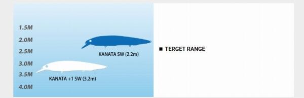 カナタ+1 SWは、カナタSWの潜行深度より1m深く、最大潜行深度を3.2mに設定したダイビングモデル。カナタSWと同様、160mmというビッグサイズにも関わらず引き抵抗は極めて軽く、テンポよくエリアをサーチするレスポンシビリティも兼備。更に磨きをかけたハイピッチ・ロールアクションにより、ビッグボディとは思えないナチュラルタイトな波動とリアルな明滅アピールを生み出します。防波堤や沖堤など足場の高い場所からのアプローチで、一段下のレンジを足元まできっちりと攻め抜くことが可能なカナタ+1 SWは、大型のベイトを追って日中にタナ落ちしたシーバスや青物の攻略に無類の強さを発揮します。圧倒的な存在感と、捕食中枢を刺激してやまないナチュラルな泳ぎを両立させた、ハイインパクトミノー「カナタ+1 SW」が、フィールドをより広く、より深く攻略します。