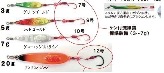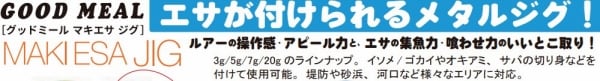 ルアーの操作感・アピール力と、エサの集魚力・喰わせ力を合わせた新コンセプトジグ『グッドミール 巻きエサジグ』。EGGシリーズのロッドやGOODシリーズのロッドはもちろん、エギングロッドやバスロッド、シーバスロッドでも扱える3g/5g/7g/20gのラインナップで、イソメ/ゴカイやオキアミ、サバの切り身などを付けて使用でき、堤防や砂浜、河口など様々なエリアに対応します。