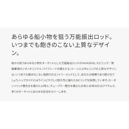 船から狙うあらゆる小物をターゲットにした万能振出ロッドがHAYASHIO。スピニング/両軸兼用のNew TPSリールシートを備えたモノトーンとメタルリングの上質なデザインは、いつまでも飽きのこない船釣りのエントリーロッドとして、あなたの相棒であり続けるでしょう。トップガイドにはラインにやさしく耐久性に優れたSiCリングを採用しています。カーボンソリッド穂先をを備えた10号と、チューブラー穂先を備えた20号と30号の計16アイテムで、多くのターゲットとあらゆる状況をカバーします。