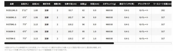 ●従来のシマノ調子を「R」調子(レギュラーテーパー)と定義し、ショートからロング、パワータイプも複数ラインナップ。