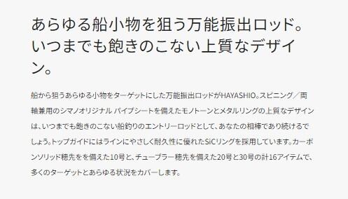 船から狙うあらゆる小物をターゲットにした万能振出ロッドがHAYASHIO。スピニング/両軸兼用のNew TPSリールシートを備えたモノトーンとメタルリングの上質なデザインは、いつまでも飽きのこない船釣りのエントリー