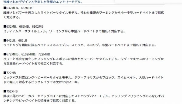 752XHB・・・難攻不落のヘビーカバーやビッグベイトに対応したストロングパワーモデル。ピッチングフリッピングのみならずパンチングやビッグベイトの遠投まで幅広く対応する。