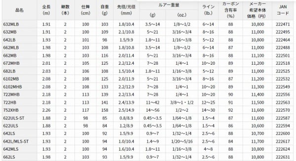 632MLB, 662MLB・・・繊細さとパワーを両立したライトバーサタイルモデル。喰わせ重視のワーミングから小〜中型ハードベイトまで幅広く対応する。