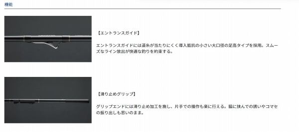 磯や堤防からの釣りに幅広く対応する多目的インターラインロッド。ブランクス内部には道糸のベタ付きを抑えるリニア構造を採り入れ、ダイワ独自の「耐久撥水加工」を施すことにより、外ガイドにも引けを取らないライン放出性を実現。操作性が高いうえ、道糸が穂先に絡みにくいという中通し構造のメリットを誰でも体感できる。従来のスタンダード&遠投タイプに加えてアオリ仕様もラインナップし、ビギナーが手にする最初の1本として、ロッド装備の間を埋めるスーパーサブとしても役立つ機動力溢れるハイコストパフォーマー。カゴ釣りをはじめ、ウキサビキやカマス狙いの投げサビキなどに幅広く対応。穂先への糸絡みが少なく夜釣りにも最適。