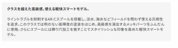 ライントラブルを抑制するAR-Cスプールを搭載し、淡水、海水などフィールドを問わず使える汎用性を追求。このクラスでは例のない高輝度の塗装をはじめ、高級感を演出するメッキパーツをふんだんに使用。