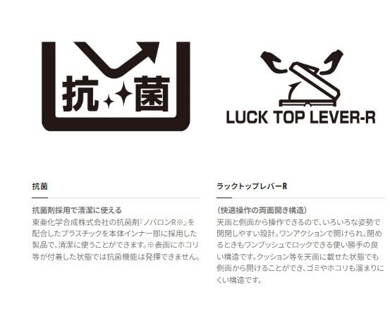 タはワンアクションで開き、落としただけでロックされるラックトップレバー ■天面から引き上げる両面開き仕様で、左右が壁に挟まれてもフタの取り外しが可能 ■本体内部に補強リプを設け、ボディ全体の強度を確保。軽量化も両立したタフ&ライト