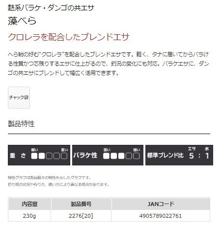 適度のネバリがでるので、タナにとどいてからバラける性質があります。麩材にクロレラが含まれさなぎとは違った集魚性があります。ダンゴエサのベースに使用したり、最後のしめエサに混ぜ込むなど多様に使用できます。また、野釣り場で「マッシュ」などをベースにしたときなどは相性が良く、大型(カタモノ)狙いにも威力を発揮します。麩はある程度硬めに仕上げられ、自在にコントロールしやすくなっています。両ダンゴでは「バラケマッハ」2+「藻べら」2+水1でヤワに仕上げ、30〜40回くらい練り「軽麩」1でしめたエサは芯残りも良く、準山上湖やダム湖の釣りで多くのファンを持ちます。