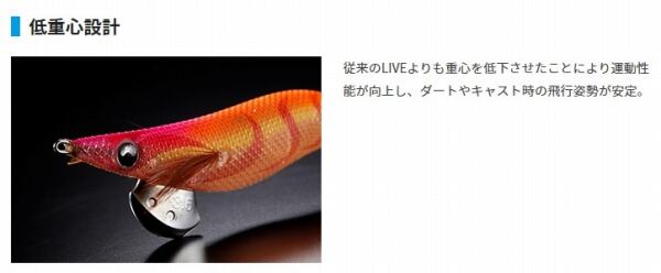 よりキレのあるダートを目指し、素材と形状を一から見直し行った。 そしてトライ&エラーを繰り返し生まれたのがこの「ブレイドシンカー」。 先代の「エギ王 Q LIVE」のダート性能をさらに引き上げ、研ぎ澄まされた刃物の如く、水を切り裂き、エギに命を吹き込む。 シンカー側面にはウエイトチューン用のガイド穴を設けており、上級者の方は自分のウエイトセッティングをすることも可能となっている。