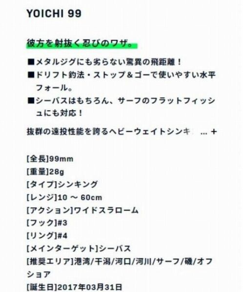 抜群の遠投性能を誇るヘビーウェイトシンキングペンシルのYOICHI 99。ラフウォーターになりやすい磯のヒラスズキや、広大なサーフを探るフラットフィッシュに相性抜群。カップ形状のフェイスは引き抵抗を感じやすく、水中イメージを的確にアングラーへ伝えます。また、流れに対して浮き上がりやすい性質を持つため、シャローエリアにもおすすめです。