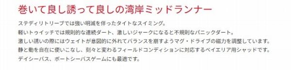 静と動を自在に使いこなし、刻々と変わるフィールドコンディションに対応するベイエリア用シャッドです。