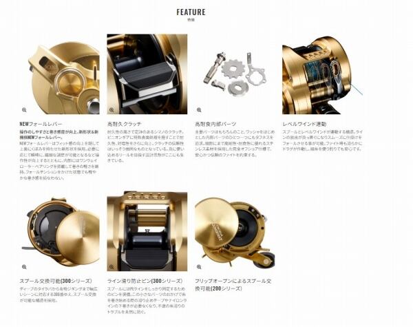 ●滑・強・操の進化は続く。精密なマイクロモジュールギアと堅牢なHAGANEボディ、高耐久の内部パーツが一体となって生み出される滑らかで力強い巻き上げ。その性能をさらなる高みへと引き上げるべく、インフィニティドライブを搭載して巻きの軽さ、力強さとともに感度も向上。Xプロテクトを搭載することで防水性能・耐久性も高めました。新形状NEWフォールレバーは仕掛けの沈下速度を素早く正確に制御。ワンウェイローラーベアリングの搭載で巻き取り方向では回転が重くならない画期的なオリジナル機構を搭載。200サイズはボディを前作よりコンパクト化し、レベルワインド連動モデルとしては初となるフリップオープン搭載でスプールへより簡単にアクセスすることが可能になりました。
