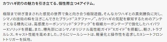 極限まで研ぎ澄まされた感覚の世界で魚と向き合う極限遊戯。そんなカワハギとの真剣勝負に対し、シマノの技術の粋を注ぎこんできたブランド“ステファーノ”。カワハギの気配を察知するためのアンテナとなる穂先には、高感度カーボンソリッド“タフテック”を極細カーボンテープで強化したハイパワーXソリッドを搭載。また、穂先部にはシマノオリジナル高性能ガイド“Xガイド”を搭載し、軽さ、トラブルレス、キャスト性能を高めました。さらにリールシートは、軽量化と操作性を追求したXシートフロントトリガーを採用。