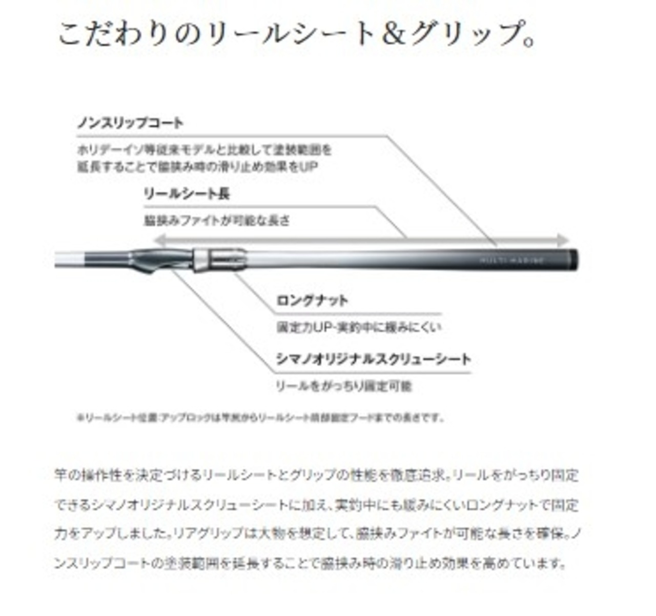 キャスト・ファイト時などの高負荷を頼もしくアシストする基本構造スパイラルX、リールのガタつきを防止するスクリューシート、脇挟みでの保持が可能なリールシート長など、細部の性能まで、アングラーにストレスフリーで軽快な実釣性能の提供を追求しました。