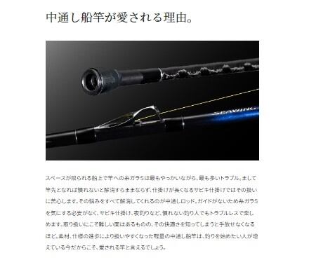 ネジレに強いハイパワーX構造を採用したブランクスは、操作性に優れ、アタリも明確に伝えてくれます。また、ラインの導入口にあたるガイドフレームには、ライン抵抗を抑える大口径エントランスガイドとライン収束用ガイドのダブルリング構造を備え、ロッド内部へのスムーズなライン導入を実現します。穂先タイプには、自然に喰わせるソフトな内径1.7mm穂先(30-270T、50-240Tに採用)と、ウキ止めも楽に通る内径3.0mm穂先(50-270T3〜150-270T3)を採用。インナーガイドロッド(中通し竿)は、鈎数の多い仕掛けや夜釣りでのガイド糸絡みなどのトラブルを解消することが特徴です。軽量でロッド基本性能を向上させたシーウィングは、より快適な釣りを楽しむことができます。