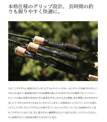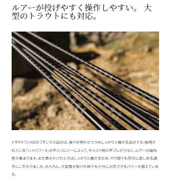 エリアトラウトロッドに求められる基本性能を向上させたベーシックシリーズが「トラウトワンAS」。ブランクスには強化構造[ハイパワーX]を採用し、キャストにおけるティップのブレやファイト時におけるパワーロスを削減。ティップにはチューブラーにしなやかさを与えた[ソフチューブトップ]を搭載。操作性や感度を損なわず、ついばむようなショートバイトに対応できます。多種多様なルアーやポンドに対応できるアイテムラインナップにより高次元のエリアトラウトゲームを展開できます。