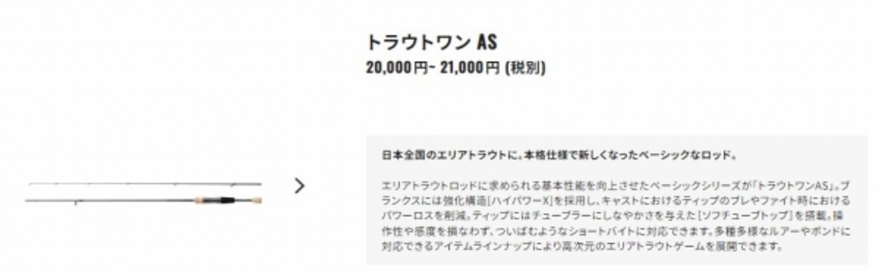 エリアトラウトロッドに求められる基本性能を向上させたベーシックシリーズが「トラウトワンAS」。ブランクスには強化構造[ハイパワーX]を採用し、キャストにおけるティップのブレやファイト時におけるパワーロスを削減。ティップにはチューブラーにしなやかさを与えた[ソフチューブトップ]を搭載。操作性や感度を損なわず、ついばむようなショートバイトに対応できます。多種多様なルアーやポンドに対応できるアイテムラインナップにより高次元のエリアトラウトゲームを展開できます。