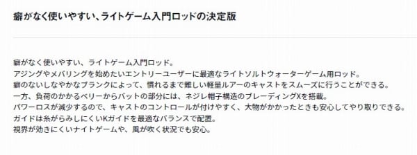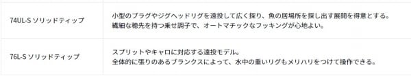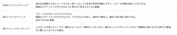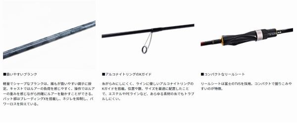レスポンスが高いチューブラー穂先によってルアー操作をしやすいので、細かなシェイクやトゥイッチなどで積極的に誘いを入れる釣りに最適。手に響くようなアタリも魅力。